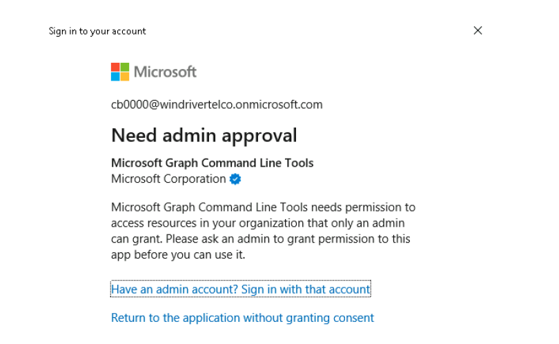 Connect-MgGraphA sign-in pop-up will appear. Enter the user principal name (UPN) and password, then click Sign in. At this point, you will notice that the process fails because admin consent is required in order to proceed.