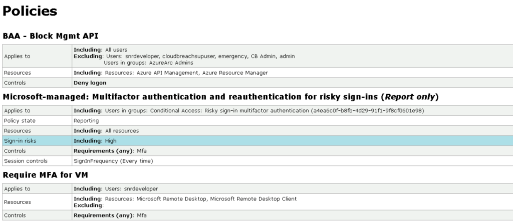- Before opening the Roadrecon GUI, let’s first review the Conditional Access Policies. Open the caps.html report, and you will see that there are three policies in place. The first policy is configured to block all management APIs (such as Azure API Management and Azure Resource Manager). This explains why our earlier attempts to authenticate using the az CLI, Connect-AzAccount, or even the Azure portal were unsuccessful. Notably, this policy applies to all users except members of the AzureArc Admins group. The second policy is a Microsoft-managed policy that is set to Report-only mode, meaning it does not actively enforce restrictions but provides visibility and the third policy enforces MFA to snrdeveloper user when RDP to a Virtual Machine.