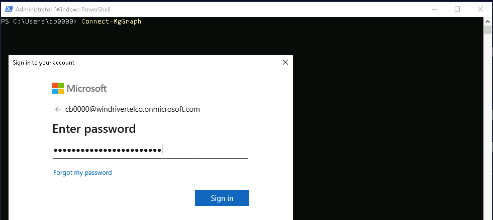 Connect-AzureAD Enter the user principal name (UPN) and password, then click Sign in to authenticate as cbxxxx@windrivertelco.onmicrosoft.com user.