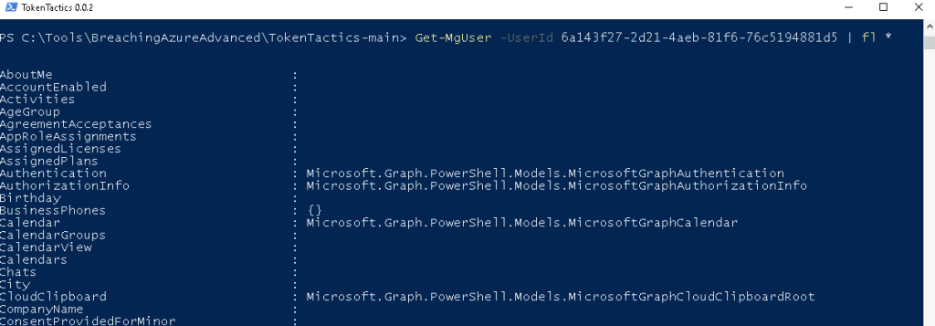 Get-MgUser -UserId 6a143f27-2d21-4aeb-81f6-76c5194881d5 | fl *Output: