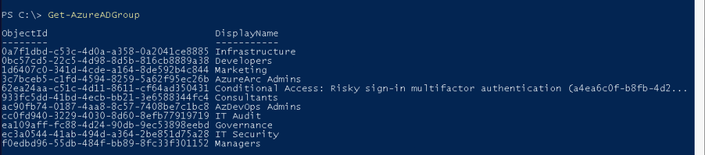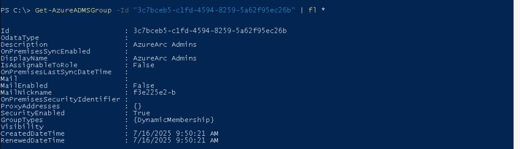 Get-AzureADMSGroup -Id "3c7bceb5-c1fd-4594-8259-5a62f95ec26b" | fl *Output: