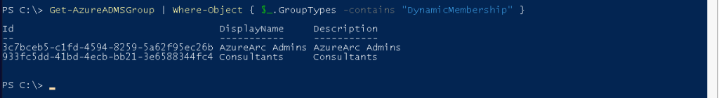 Get-AzureADMSGroup | Where-Object { $_.GroupTypes -contains "DynamicMembership" }Output: