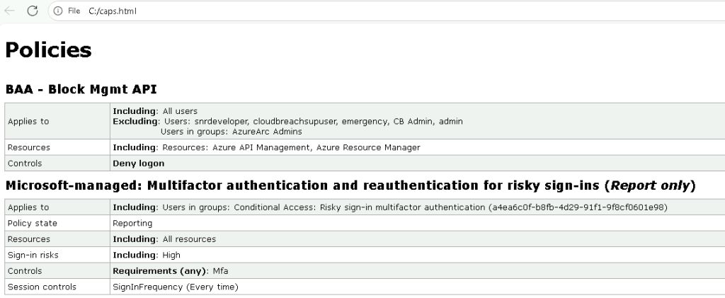 - Before opening the Roadrecon GUI, let’s first review the Conditional Access Policies. Open the caps.html report, and you will see that there are two policies in place. The first policy is configured to block all management APIs (such as Azure API Management and Azure Resource Manager). This explains why our earlier attempts to authenticate using the az CLI, Connect-AzAccount, or even the Azure portal were unsuccessful. Notably, this policy applies to all users except members of the AzureArc Admins group. The second policy is a Microsoft-managed policy that is set to Report-only mode, meaning it does not actively enforce restrictions but provides visibility.